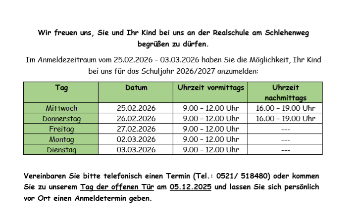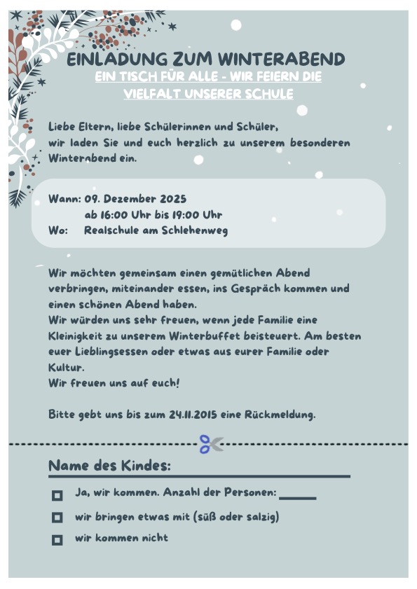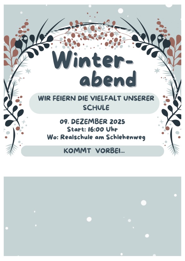am 05. Dezember 2025 findet von 17:00 bis 18:30 Uhr der Tag der offenen Tür an der Realschule am Schlehenweg statt. Die entsprechende Einladung kann hier eingesehen werden.